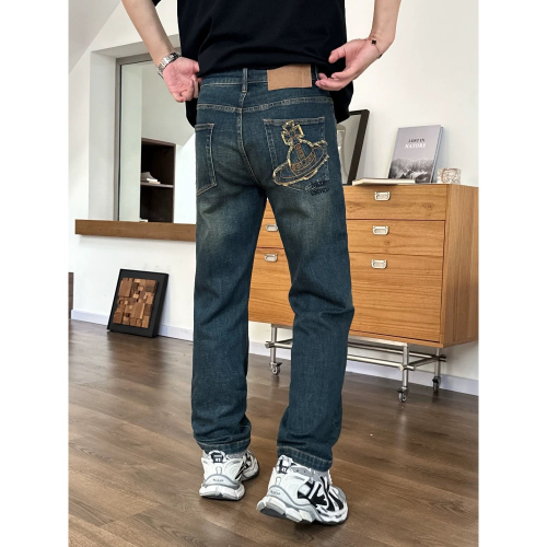 Vivienne Westwood 牛仔褲 土星刺繡高時尚簡約繡標刺繡直筒修身休閒褲 男士百搭水洗牛仔褲百搭 舒適休閒時