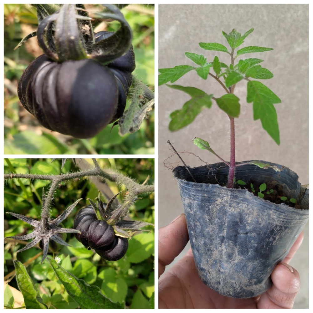 黑番茄被喻為廿一世紀「超級食物」,比一般番茄多了青花素、抗氧化效果佳,果型為大果,果實由綠轉黑,果實表面有不規則皺折,皮薄味甜,生長旺盛。
