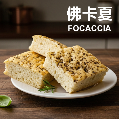 佛卡夏 的原文FOCACCIA 是拉丁文,意思是「用火烤的東西」 ,是一種有一千多年歷史的義大利平民麵包,是從前義大利家家戶戶火爐上烘烤的家常麵包,佛卡夏麵包被認為是厚皮披薩前身,兩者的區別為佛卡夏重在麵包本身,而厚皮批薩比較重在餡料。