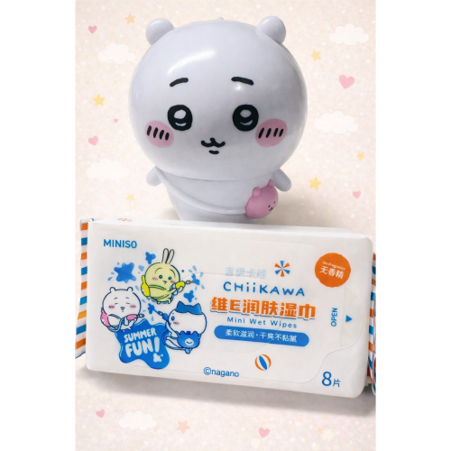 • 產品名稱: MINISO® 吉伊卡哇系列維生素 E 潤膚迷你濕巾 (8片x8包)