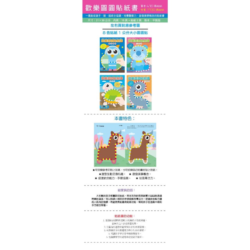 巧育 歡樂圓圓貼紙書(一套4本) 單本430張貼紙 全套1720張貼紙 一套能促進手、眼、腦統合協調、培養觀察力、發美學概念的貼紙書 尺寸:21x30公分 頁16頁+貼紙2頁 版本平裝 8色貼紙1公分小圓圓貼 -貓頭鷹篇  -小熊篇 -烏龜篇 -恐龍篇 本書特色: 可依照參考圖貼上貼紙,也可照自己的喜好貼上貼紙。 造型生動活潑有趣。 啟發美學概念。 促進統合能力、手眼協調。 培養專注力。 給家長的話: 大多數的孩子都喜歡玩貼紙,而本系列的寶貝啟蒙大圓圓貼透過 簡單的遊戲,可以訓練小朋友的手眼協調及專注力,促進統合能力達 成小肌肉的發展,希望家長能善用紙功能,幫助孩子在遊戲中得到 多方面的學習。 貼紙書的功能: 1.透過組合黏貼的遊戲方式讓孩子引起興趣, 在無形之中達成學習效果。 2.在黏貼的過程中能訓練孩子的手眼協調。 3.可訓練孩子的感覺統合與小肌肉的發展。 4.可讓孩子學習思考與對應關係。 5.在遊戲學習的過程中促進親子關係。