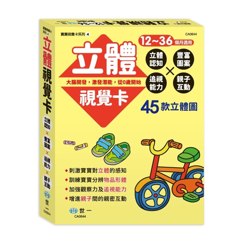 0到3歲,是幼兒大腦發育的黃金時期.眼睛,是寶寶接收外界資訊最有效的管道.寶寶接受的視覺刺激越多,頭腦的各項發展就會越精密.在12到36個月寶寶視力已達到一定程度,立體視覺觀察和認知能力發展迅速,這款立體卡色彩鮮豔,圖案內容 可愛豐富,適合寶寶的視覺神經發育,有助於幼兒對色彩與形體的啟蒙認知.