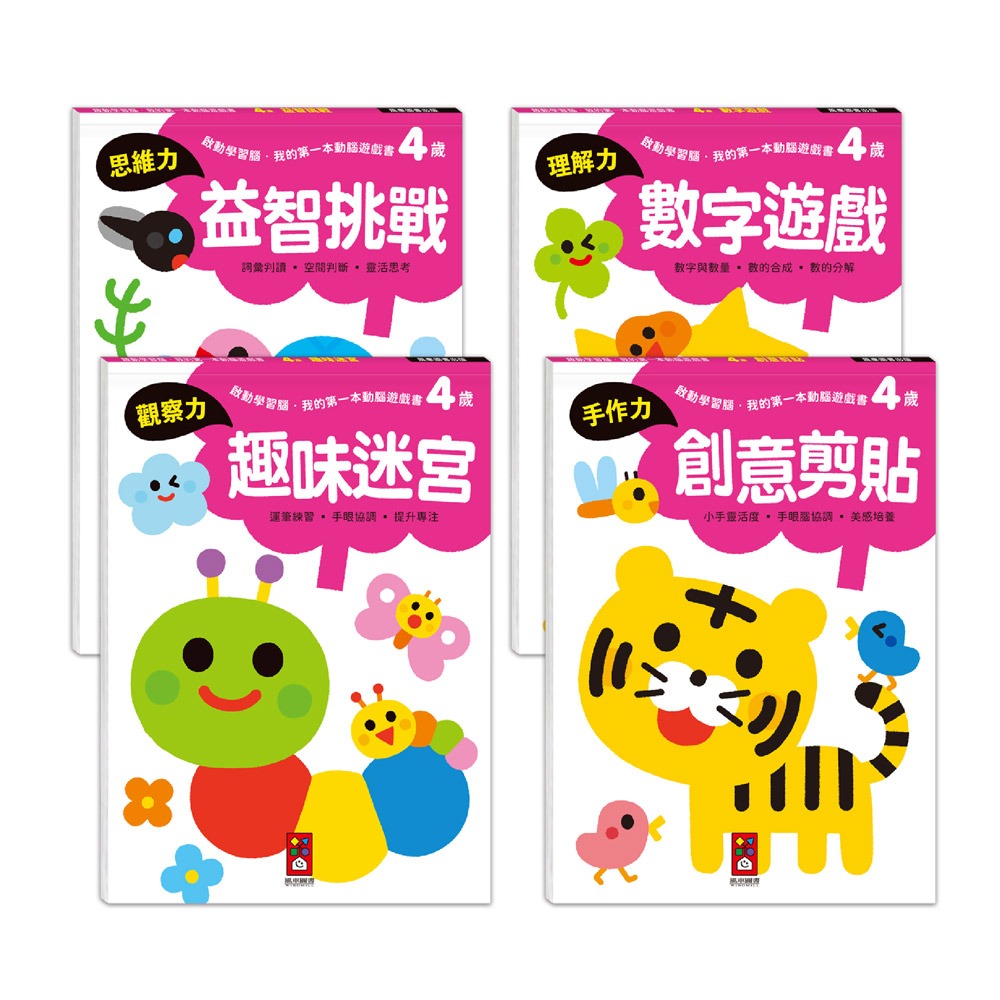 內含4冊練習本:《4歲數字遊戲》、《4歲益智挑戰》、《4歲趣味迷宮》、《歲創意剪貼》