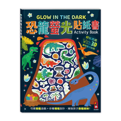 《恐龍螢光貼紙書》除了有3D螢光的泡泡貼紙之外,書末也有不同勞作遊戲可以自己動手裝飾家裡或房間,也有益智遊戲可以多人一起玩。除此之外有多種不同的思維遊戲,如:著色、找一 找、單字練習、連線遊戲、尋寶遊戲、數數、連連看……等,全方位開發孩子大腦潛能,一起探索奇妙的恐龍世界吧!