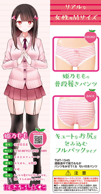 Vtuber姫乃もも公式コラボ商品 女子校生の普段履きパンツ キュートなお尻を包み込むフルバックタイプ リアルな女性用Mサイズ 匂い付き 数量限定 香る女子校生のいい匂い イラスト:大嘘 姫乃ももヒメノ モモ属性:保健委員長 サイズ:T150cm B87cm(Eカップ)W58cm H89cm 性格:しっかり者だけど寂しがりや。困ってる人はほっとけない。 特技:エロエロマッサージ 趣味:カラオケ、お散歩 ママ:大嘘