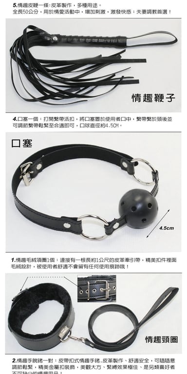 (眼罩+鞭子+口塞+乳夾+手腕銬+腳腕銬+頸圈)