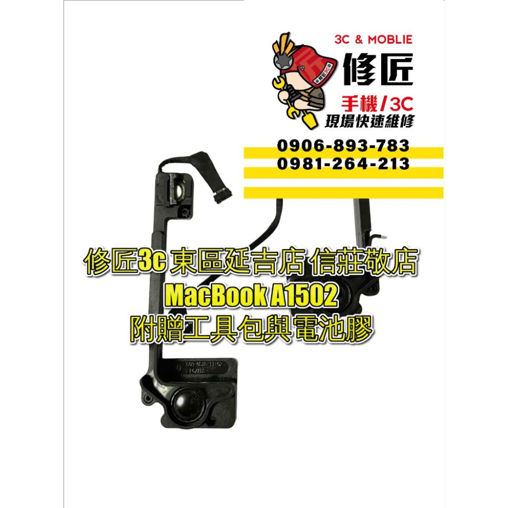 https://s-cf-tw.shopeesz.com/file/tw-11134208-7qul4-lhvj3w3wbj4g00 現場快速安裝 施工時間30分鐘即可取件 透明化維修更換 提供長達3個月保固 現場快速安裝 施工時間30分鐘即可取件 透明化維修更換 提供長達3個月保固 MacBook A1502喇叭電池連工帶料安裝完成 !1499!元  (門市僅提供現場維修 無提供零件自取)      修匠3C 【大安東區延吉店】    地址:台北市大安區延吉街140之1號1樓       *正延吉街上*(非巷內)  過忠孝東路四段216巷看到延吉街!右轉!  順方向右手邊可看到修匠3C 【東區延吉店】      修匠正對是{南屏鵝肉}        右邊是{遠傳電信}        左邊是{佃權關東煮}      營業時間:中午12點到晚上9點       (無空班時間~無公休日)        電話:0906893783     (大安東區延吉店公務機號碼)      修匠3C【信義莊敬店】    地址:台北市信義區莊敬路451號1樓    (近松仁路與莊敬路口~卡多摩旁)      修匠正對{中華電信}        右邊{寶島鐵板燒}        左邊{卡多摩信義莊敬店}      營業時間:中午12點到晚上9點       (無空班時間~無公休日)        電話 :0981264213       (信義莊敬店公務機號碼)      其餘型號零件可至修匠    賣場查詢https://shopee.tw/fixphone451    或者https://shopee.tw/hankchentp #台北維修 #專業快速維修 #台北專業速修 #3C維修 #現場維修 #快速維修 #電池更換 #電池耗電 #充電不良 #電池老化 #電池膨脹 #電池故障 #電池衰退 #電池維修 #自動關機 手機殼 iphone 13 手機殼 apple watch 錶帶 airpods pro 保護套 airpods 保護套 iphone 12 手機殼 iphone 11 手機殼 行動電源 iphone 13 apple watch iphone iphone 13 pro 手機殼 iphone 13 pro max 手機殼 手機掛繩 i13 手機殼 犀牛盾 ipad 手機 iphone 11 手機架 13 pro 手機殼 小米手環 6 12.9 手機支架 airpods iphone 12 Oppo i11 手機殼 iphone 13 pro ipadair 4 保護套 鼠墊 鍵盤 筆電 滑鼠 顯示卡 電腦螢幕 無線滑鼠 礦渣 3060ti 隨身碟 無線鍵盤 ssd 電腦主機 鍵帽 3070 螢幕 3080 筆電支架 機械鍵盤 筆電架 機殼 電腦 延長線 電腦機殼 標籤機 網路線 17.8 讀卡機 17.5 3070ti電池連工帶料安裝完成 !899!元 #台北維修 #專業快速維修 #台北專業速修 #3C維修 #現場維修 #快速維修 #電池更換 #電池耗電 #充電不良 #電池老化 #電池膨脹 #電池故障 #電池衰退 #電池維修 #自動關機 手機殼 iphone 13 手機殼 apple watch 錶帶 airpods pro 保護套 airpods 保護套 iphone 12 手機殼 iphone 11 手機殼 行動電源 iphone 13 apple watch iphone iphone 13 pro 手機殼 iphone 13 pro max 手機殼 手機掛繩 i13 手機殼 犀牛盾 ipad 手機 iphone 11 手機架 13 pro 手機殼 小米手環 6 12.9 手機支架 airpods iphone 12 Oppo i11 手機殼 iphone 13 pro ipadair 4 保護套 鼠墊 鍵盤 筆電 滑鼠 顯示卡 電腦螢幕 無線滑鼠 礦渣 3060ti 隨身碟 無線鍵盤 ssd 電腦主機 鍵帽 3070 螢幕 3080 筆電支架 機械鍵盤 筆電架 機殼 電腦 延長線 電腦機殼 標籤機 網路線 17.8 讀卡機 17.5 3070ti