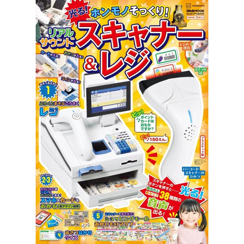 它會發光!它會發出聲音!這本精美的金錢和購物遊戲書配有一個逼真的收銀機掃描器!