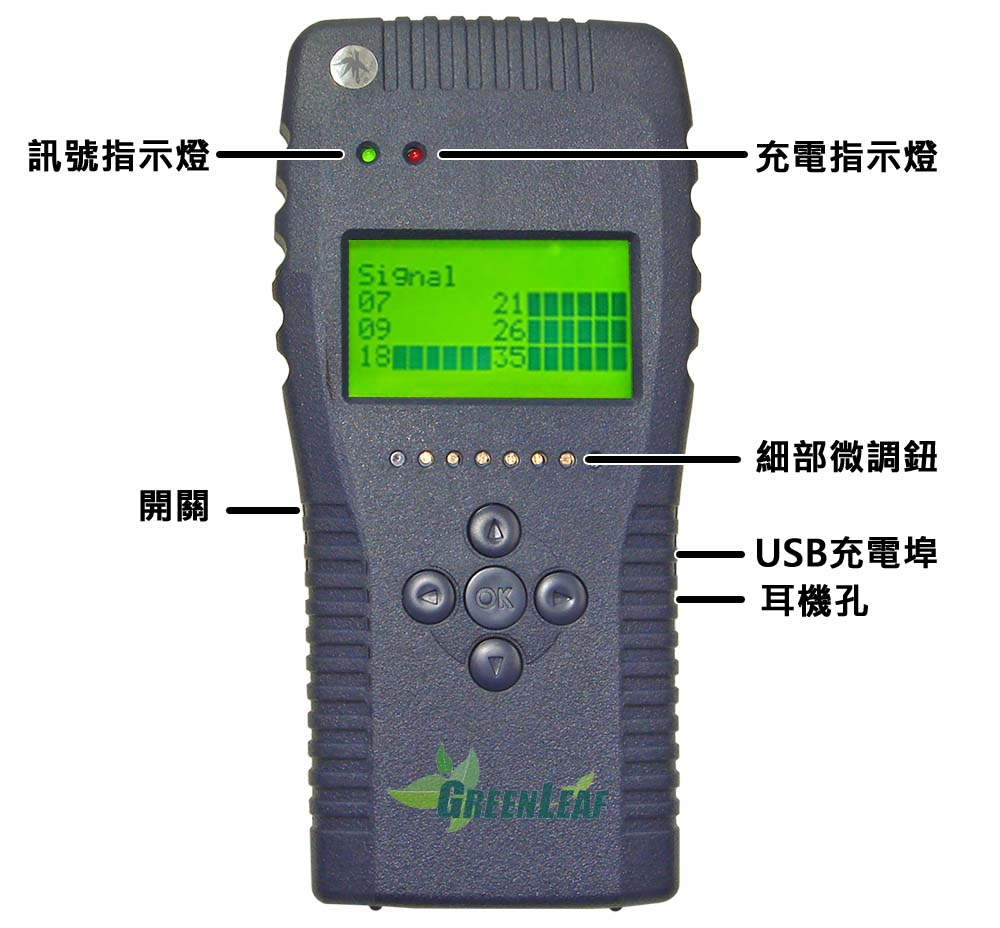 本器材在一空間中(例如會議室、辦公室),可以檢測出是否有手機使用訊號及待機狀況,再由其他儀器輔助查出手機位置。