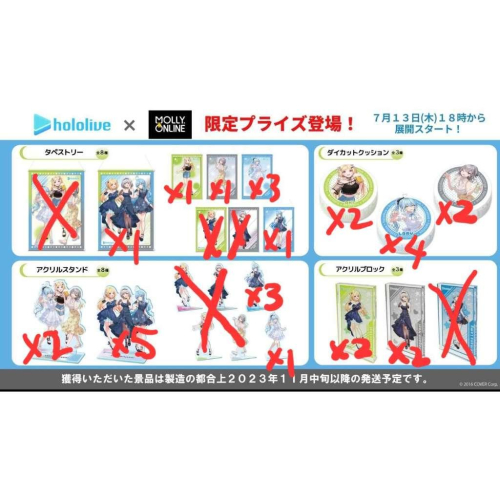 現貨可直接下單 掛軸類可用匯款郵寄或蝦皮選擇黑貓 價格與款式(套組和帶多優先) 【抱枕】1400元 【掛軸】1300元 【立牌】1100元 【壓克力磚】800 【單推菈米套組】6500(抱枕X1,掛軸X2,立牌X2,壓克力磚X1,共6樣不同款式) 【注意條款】 1. 11月中旬官方發貨,實際到手上需要時間,貨到即發貨,拆箱拆包裝時請全程錄影,以免爭議 2.掛軸有伸縮桿,保險請選擇宅配,超商取貨須自行負責斷裂破損情形 3.小掉漆視為正常狀況,非異常瑕疵接不受理 4.空海運送方式由賣家決定(量太多會走海運) 5.運送期間外包裝皆有可能破損或髒汙,海關也可能拆箱檢查請見諒 6.有問題需原包裝和所有內含物以及開箱影片,遺失皆不受理 7.此為預購商品,請先想好再訂,如有到貨後棄單將不退還訂金,並上黑單,還請多加注意 #Molly Online #Hololive #掛軸 #靠枕 #壓克力磚 #立牌 #亞綺·羅森塔爾AKI #雪花菈米Lamy #白銀諾艾爾Noel