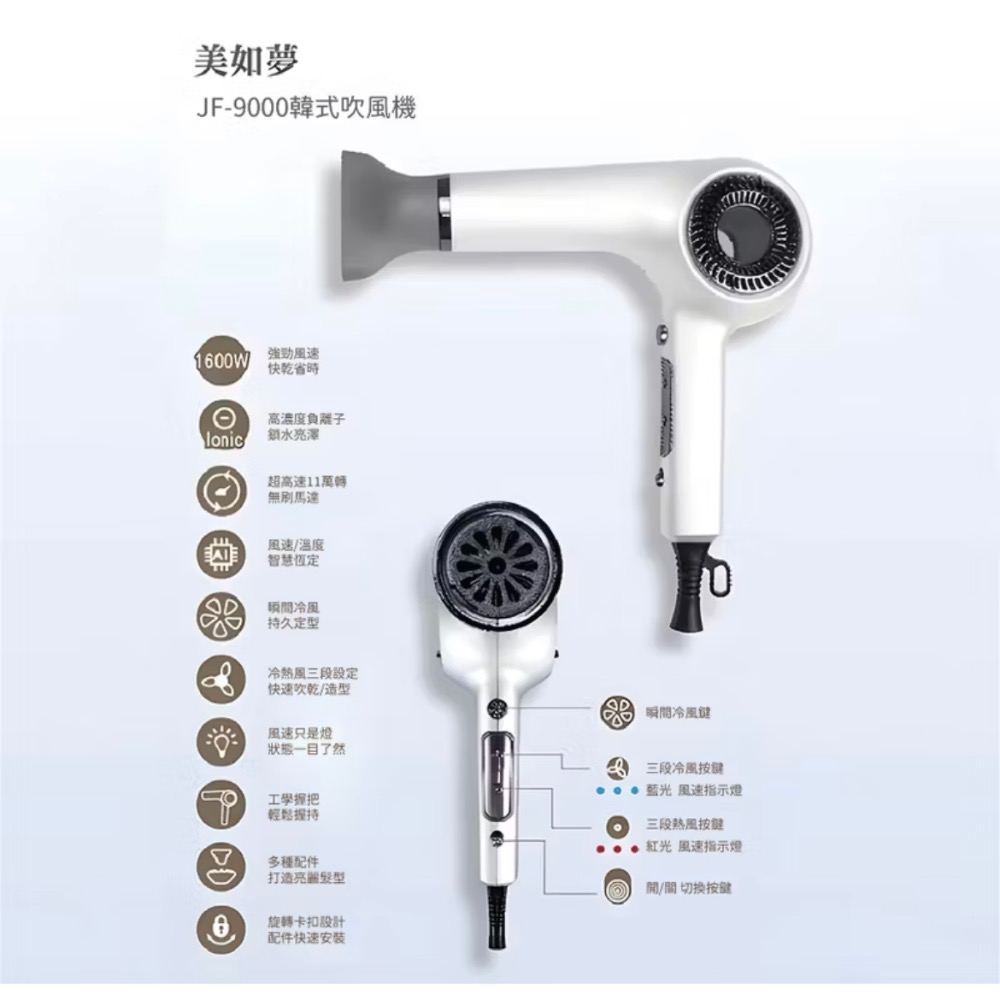 Merry Moon 美如夢 韓式吹風機 JF-9000 負離子無刷吹風機 快乾省時 鎖水亮光澤 無刷馬達 智慧恆溫