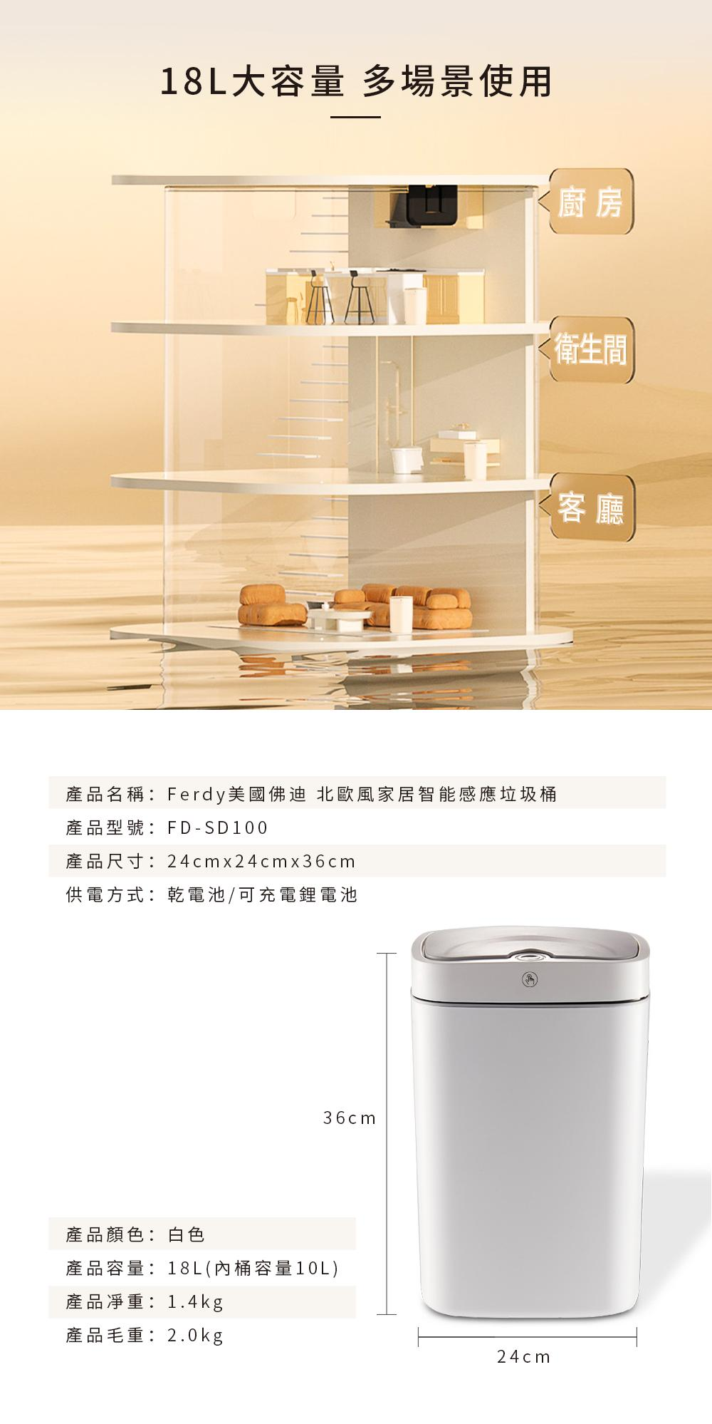 美國 Ferdy 美國佛迪 北歐風智能感應垃圾桶 FD-SD100