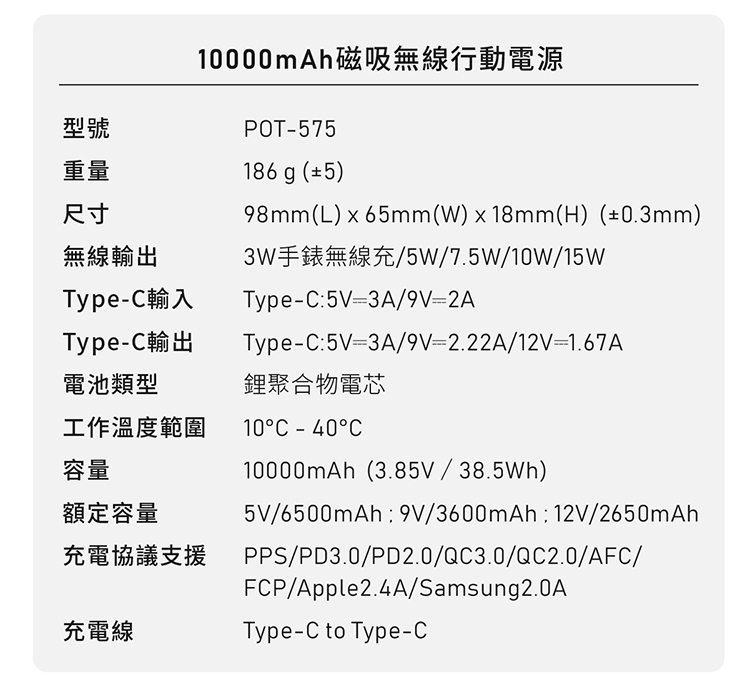 充電協議支援:PPS/ PD3.0/ PD2.0/QC3.0/QC2.0/AFC/FCP/Apple 2.4A/Samsung2.0A