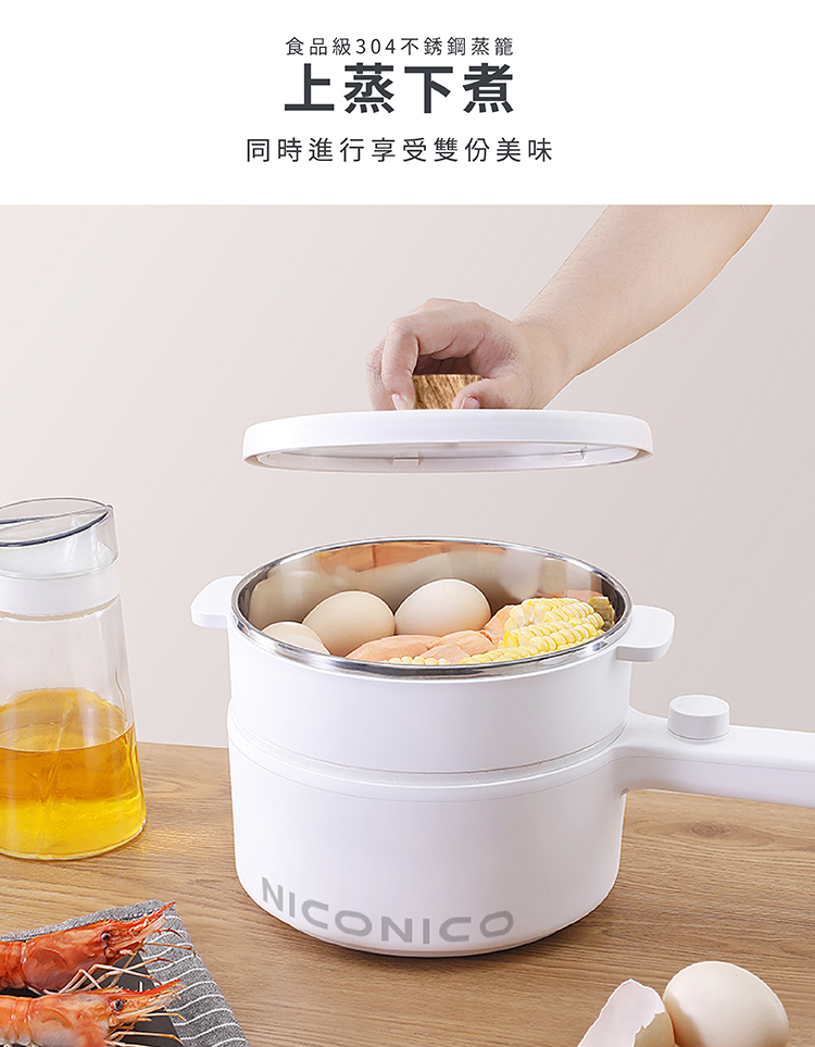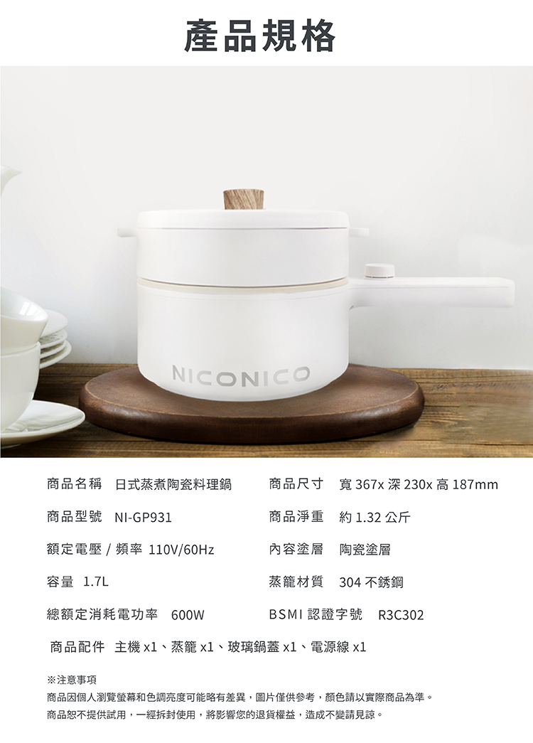 配件:主機x1、蒸籠x1、玻璃鍋蓋x1、電源線x1、說明書x1、保固書x1