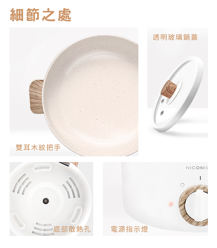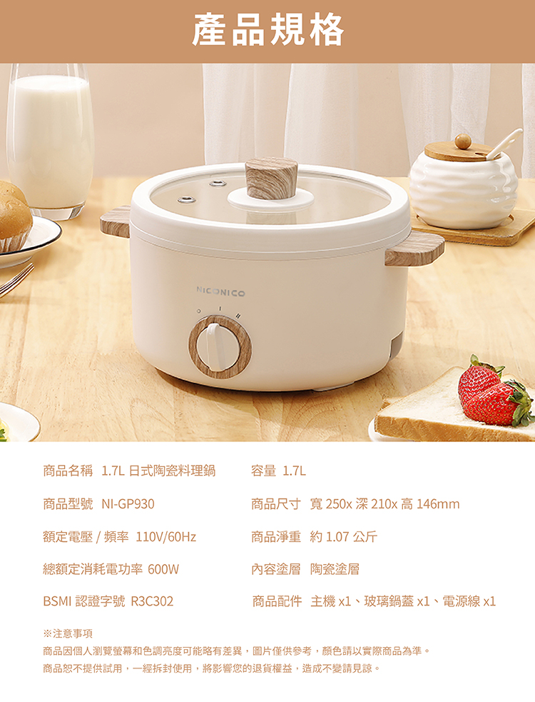 配件:主機x1、玻璃鍋蓋x1、電源線x1、說明書x1、保固書x1