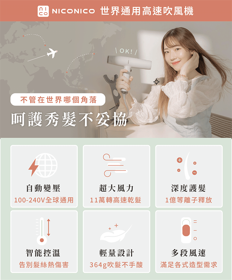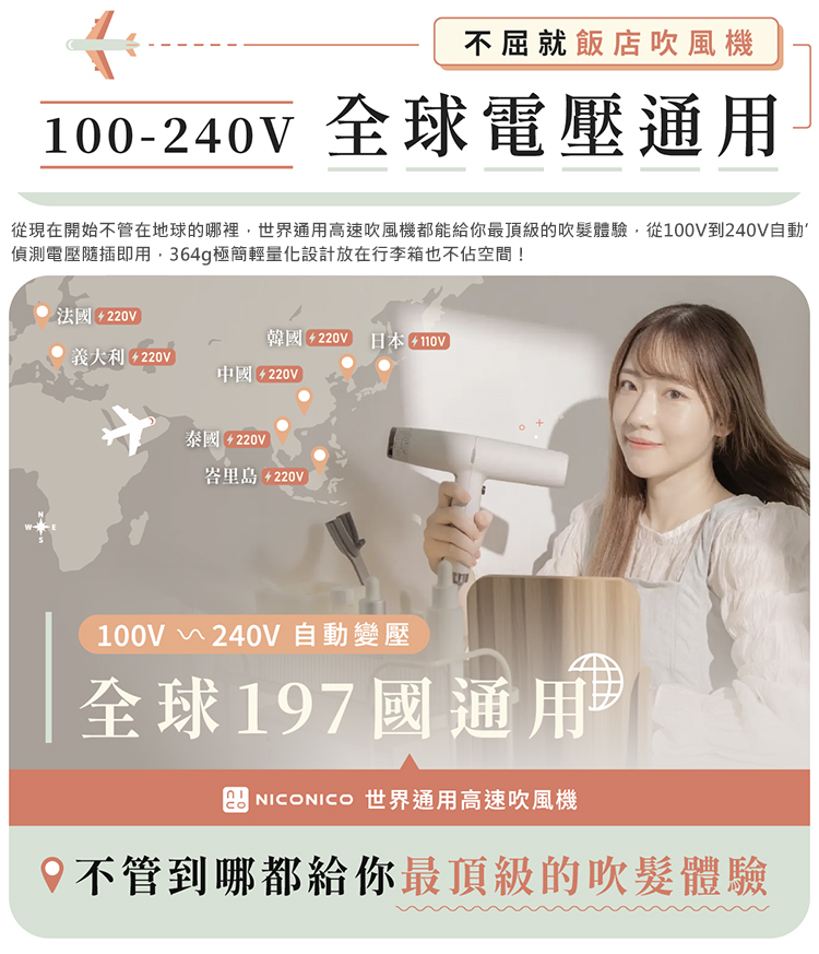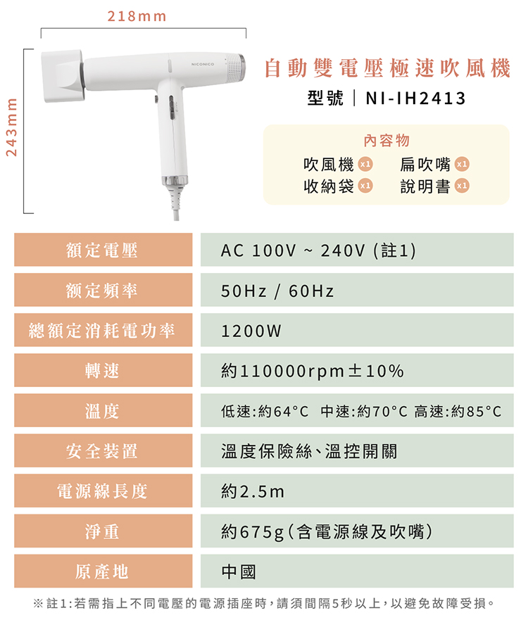 日本 NICONICO 吹風機 世界通用自動雙電壓高速吹風機 NI-IH2413