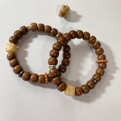 人工量測偶有錯漏請多包涵,穿搭菩提根奶酪雕刻、橄欖核跑環、牛骨雕刻藥片,六道木有天然木頭香氣,孔道周圍會有天然梅花紋路。