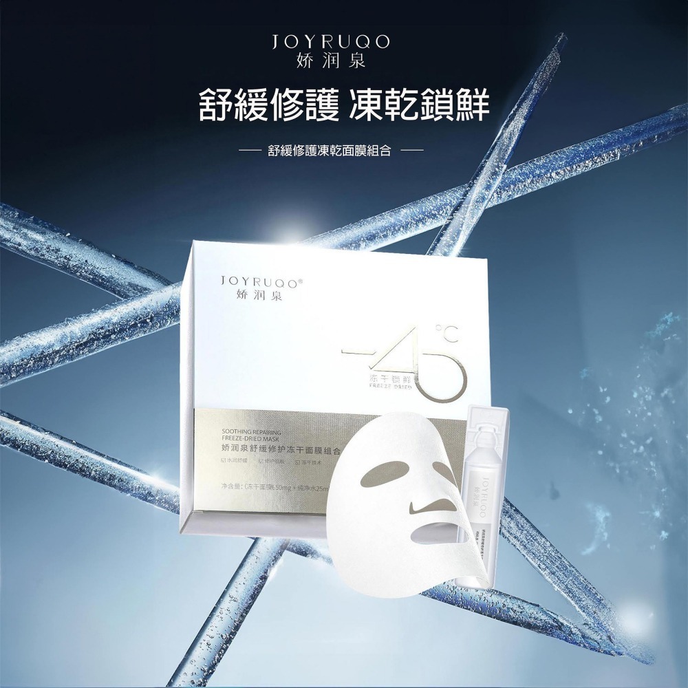 產品名稱:JOYRUQO嬌潤泉舒緩修護凍乾面膜組合 容量:5片/盒 用途:舒緩、修護、保濕、緊緻 使用方法: 1.潔面後,取出一片面膜,撕開包裝袋取出含膜布的面膜托盤 2.取出包裝內的純化水,旋開後均勻擠入面膜托盤內的膜布上,靜置一分鐘 3.待膜布充分浸潤晶瑩後,取出輕敷於面部,靜享15-20分鐘後取下 4.輕輕按摩臉部,讓精華完全吸收 凍乾面膜成份:水、甘油、荷荷巴(SIMMONDSIA CHINENSIS)籽油、羥乙基脲、丁二醇、海藻糖、鱷梨(PERSEA GRATISSIMA)油、聚甘油-6油酸酯、牛油果樹(BUTYROSPERMUM PARKII)果脂、透明質酸鈉、角鲨烷、低聚果糖、銀耳(TREMELLA FUCIFORMIS)子實體提取物、橄欖油酸鉀、環糊精、積雪草 (CENTELLA ASIATICA) 提取物、糖類同分異構體、密羅木(MYROTHAMNUS FLABELLIFOLIA)葉/莖提取物、膠原 純化水成分:水 保存方法:請密封保存放置於陰涼、避光、乾燥環境。 有效日期:如包裝所示(西元年/月/日) 注意事項: 1.避免直接接觸眼睛,如不慎入眼,請立即以大量清水沖洗。 2.請放置於嬰幼兒觸摸不到的地方,避免誤食。 3.個人膚質各有不同,請先在局部試用後再使用,如有不適,請停止使用。 原產地:中國 進口商:澤峰國際供應鏈股份有限公司 地址:桃園市桃園區中正路1082號11樓 電話:03-4498388