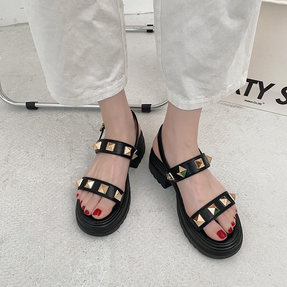❤️36黑現貨❤️鉚釘一字帶高跟涼鞋
