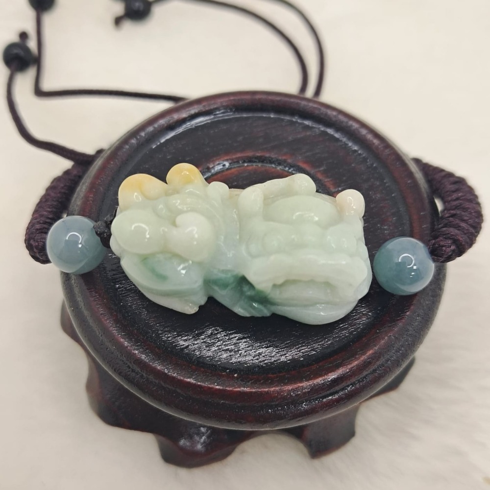 天然緬甸A貨翡翠 飄花帶黃翡 霸王 貔貅 手繩 招財 開運貔貅