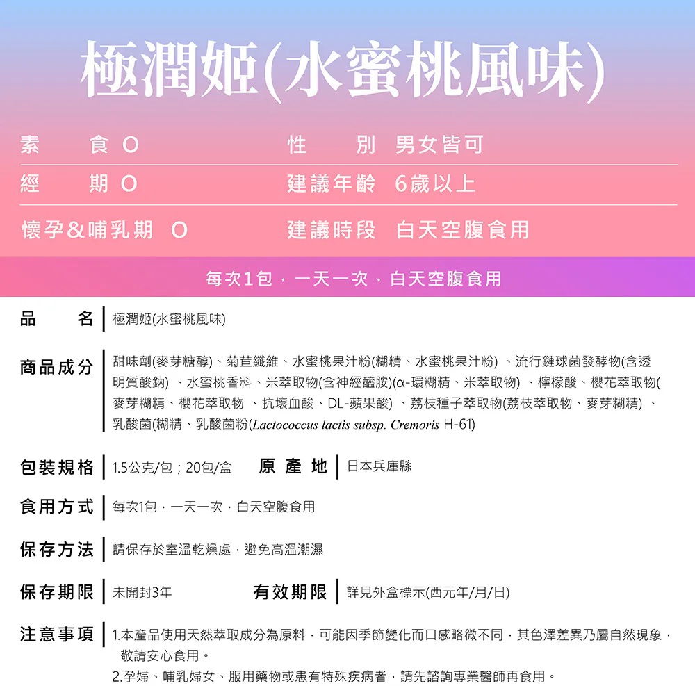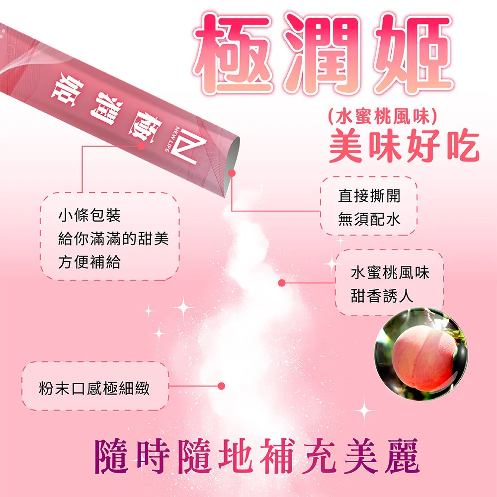 🍑 無須配水,可直接倒入口中,像粉雪一樣細緻粉末,入口即溶以及微甜的水蜜桃口味