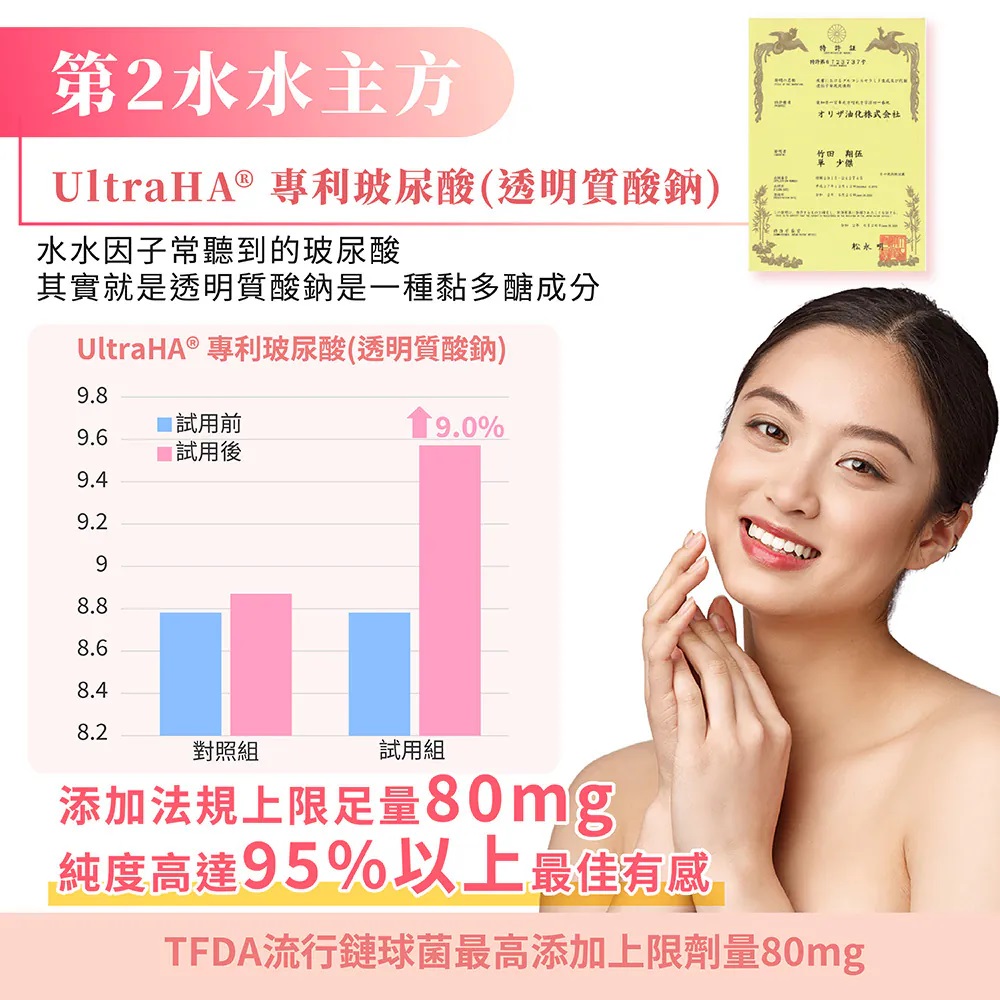 🌾 專利玻尿酸 ➙ 頂標足量80mg,透亮水潤