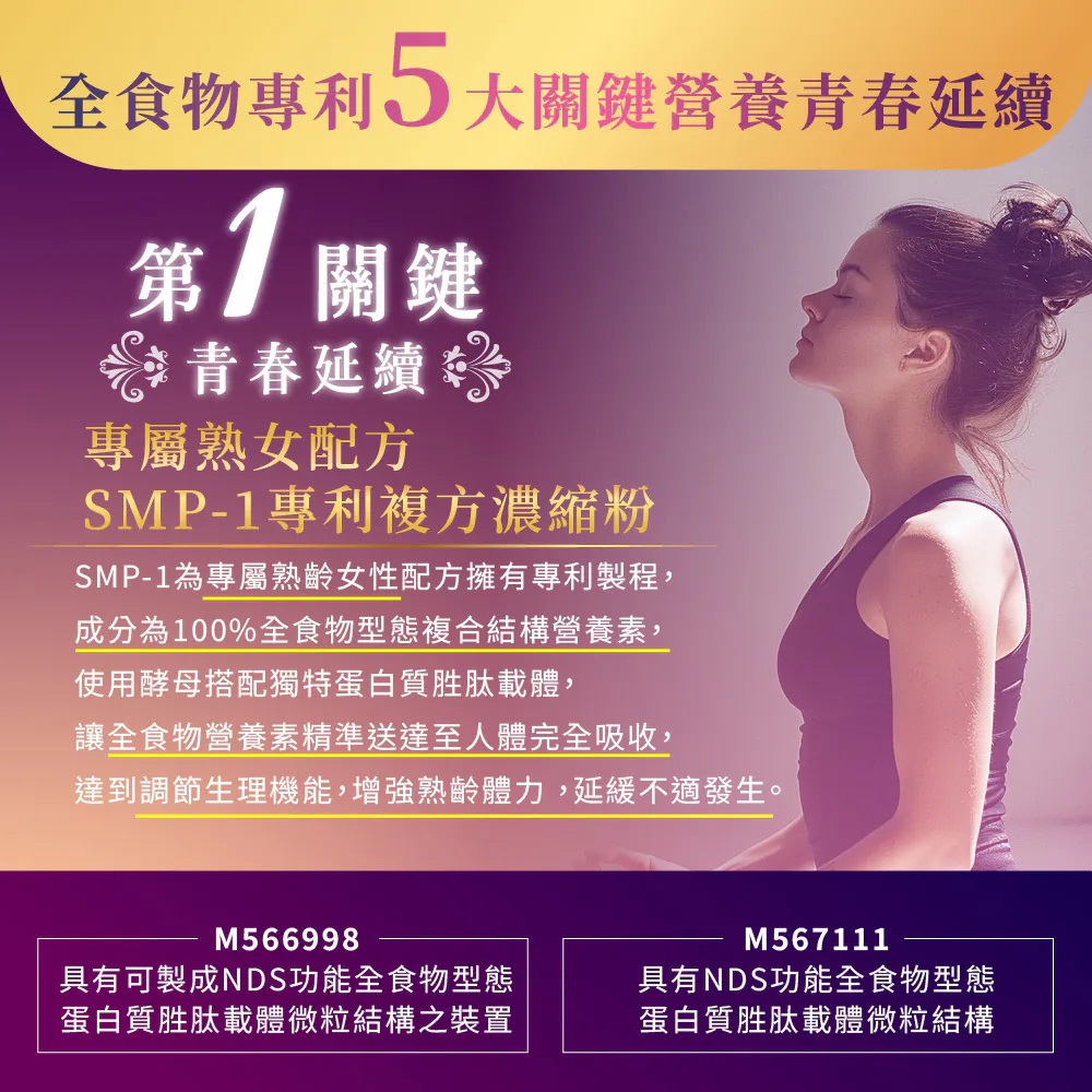 ▪︎ 專屬女性配方 ➙ SMP-1 專利複方濃縮粉:調節生理機能,增強體力,延緩不適發生