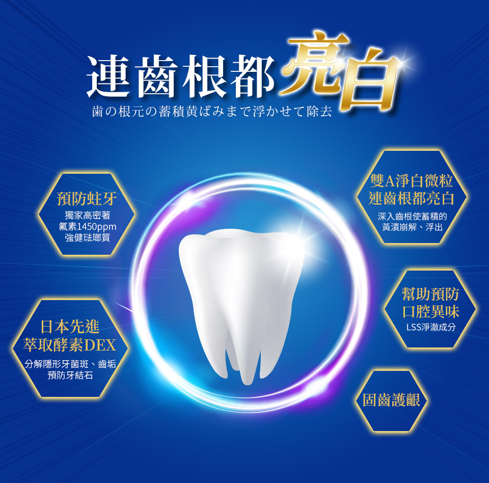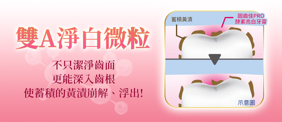 ・ 連齒根都亮白! 雙A淨白微粒不只潔淨齒面更能深入齒根,使蓄積的黃漬崩解、浮出!