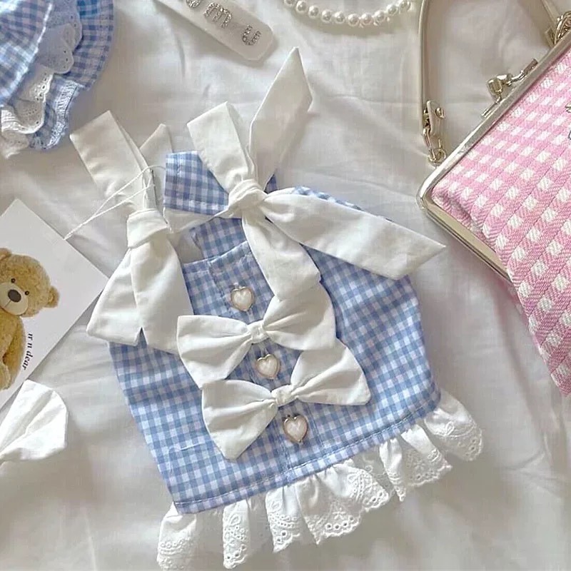 ♡【F16 預購】綁帶格子愛心珍珠釦蕾絲公主裙 夏季背心 寵物背心 貓咪背心 貓咪背心 狗狗夏天