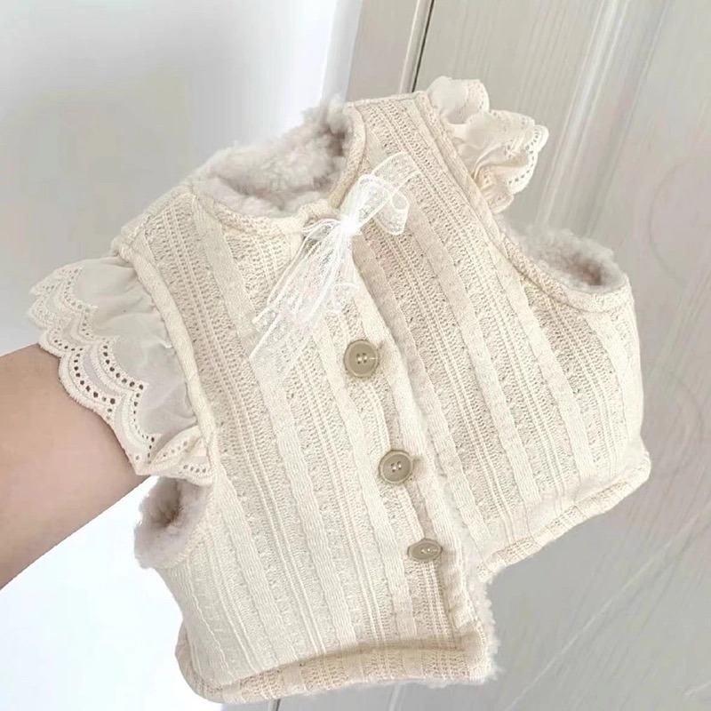 ♡【 H12 預購 】氣質米杏蕾絲飛袖蝴蝶結木釦日系寵物衣