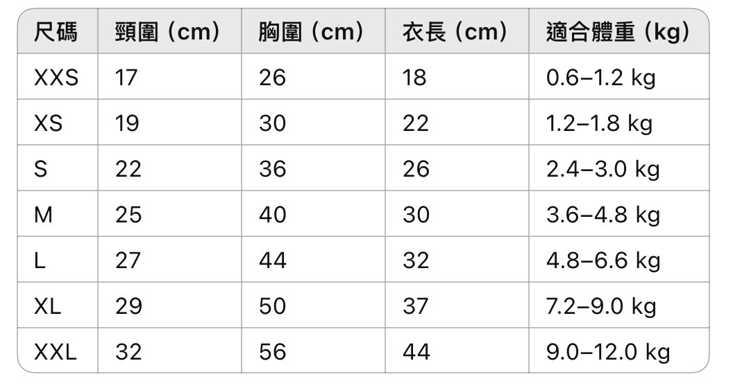 請務必再三確認毛孩的背長、頸圍或胸圍,並參考適合穿著的體重。