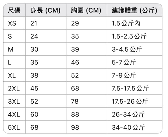 請務必再三確認毛孩的背長、頸圍或胸圍,並參考適合穿著的體重。