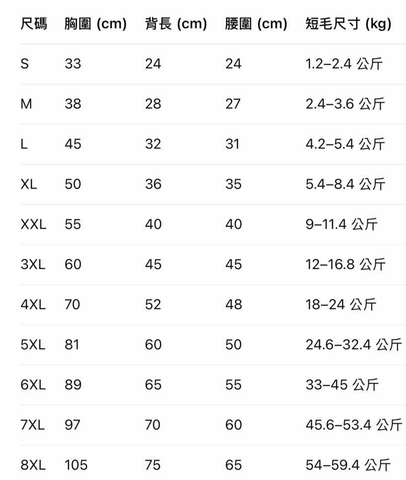 請務必再三確認毛孩的背長、頸圍或胸圍,並參考適合穿著的體重。