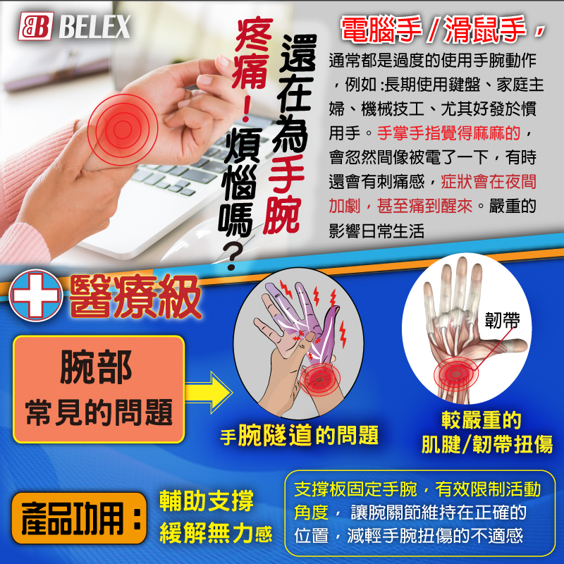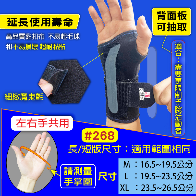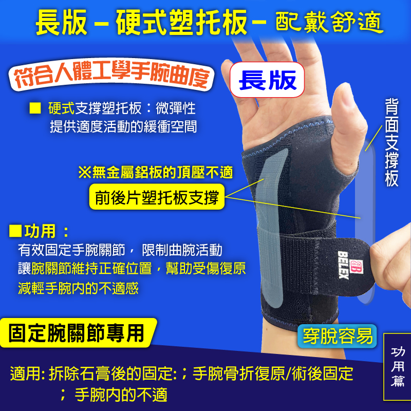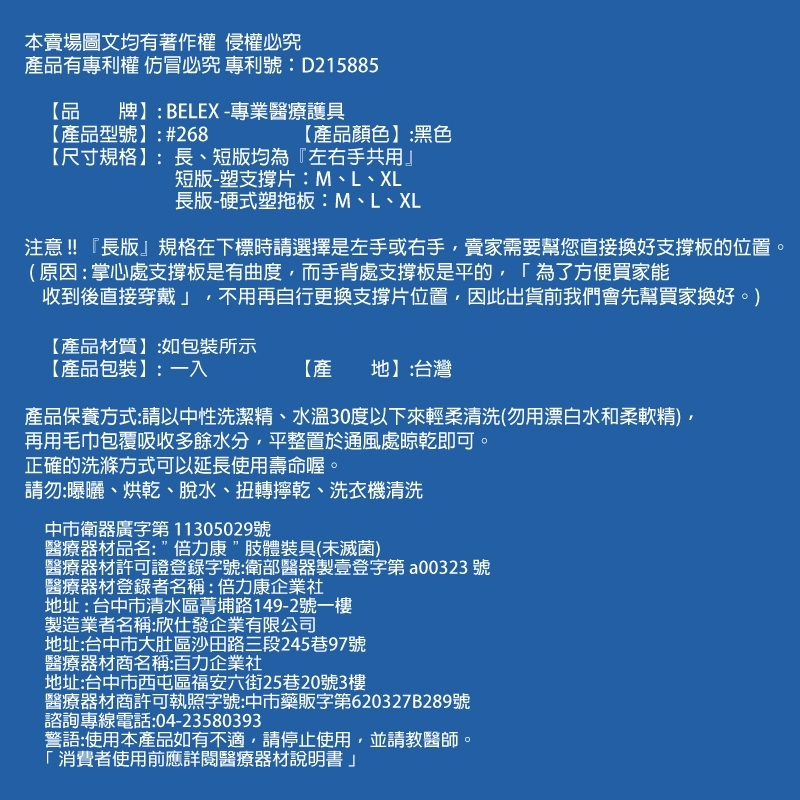 長版-硬式塑拖板:M、L、XL。 🔥 注意 !! 『長版』規格在下標時請選擇是左手或右手,賣家需要幫您直接換好支撐板的位置。 🔥 ( 原因 : 掌心處支撐板是有曲度,而手背處支撐板是平的,「 為了方便買家能收到後直接穿戴 」,不用再自行更換支撐片位置,因此出貨前我們會先幫買家換好。) 【產品包裝】: 一入 【產品材質】:如包裝所示 【產 地】: 台灣 產品保養方式:請以中性洗潔精、水溫30度以下來輕柔清洗(勿用漂白水和柔軟精), 再用毛巾包覆吸收多餘水分,平整置於通風處晾乾即可。 正確的洗滌方式可以延長使用壽命喔。 請勿:曝曬、烘乾、脫水、扭轉擰乾、洗衣機清洗