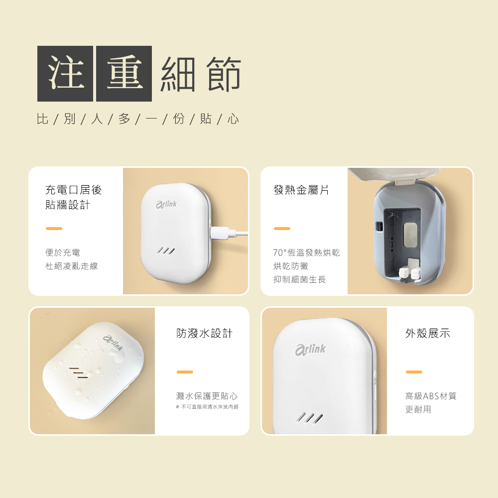 ● 具有UVC深紫外線殺菌 X 風乾 X 烘乾功能,確保牙刷無菌又乾爽