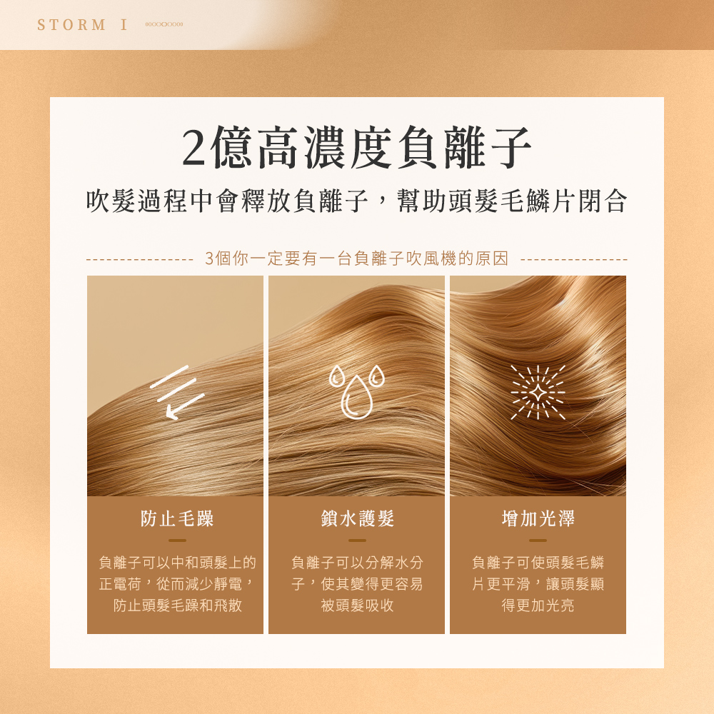 ● 吹髮過程中會釋放2億高濃度負離子,幫助頭髮毛鱗片閉合,減少靜電與毛躁,長期使用頭髮將變得更加柔順光滑