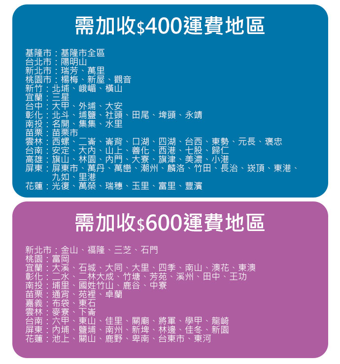 ◆本產品係由生產廠商或供應商免費提供基本運送,若因地處偏遠或其他特殊情形(例如:天災或道路狀況不良)致使所屬物流車輛無法於正常狀況下送抵而需另以其他方式處理時,所衍生之費用須由訂購人自行支付供貨廠商。