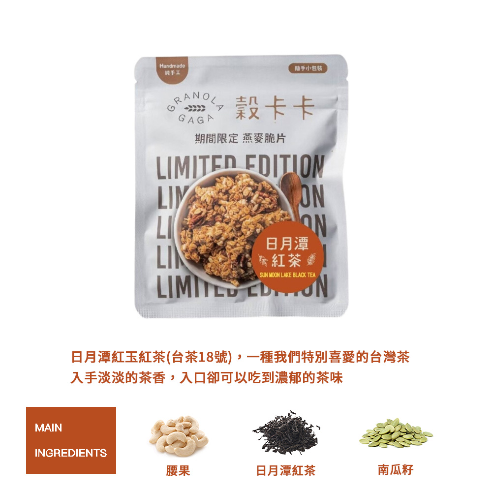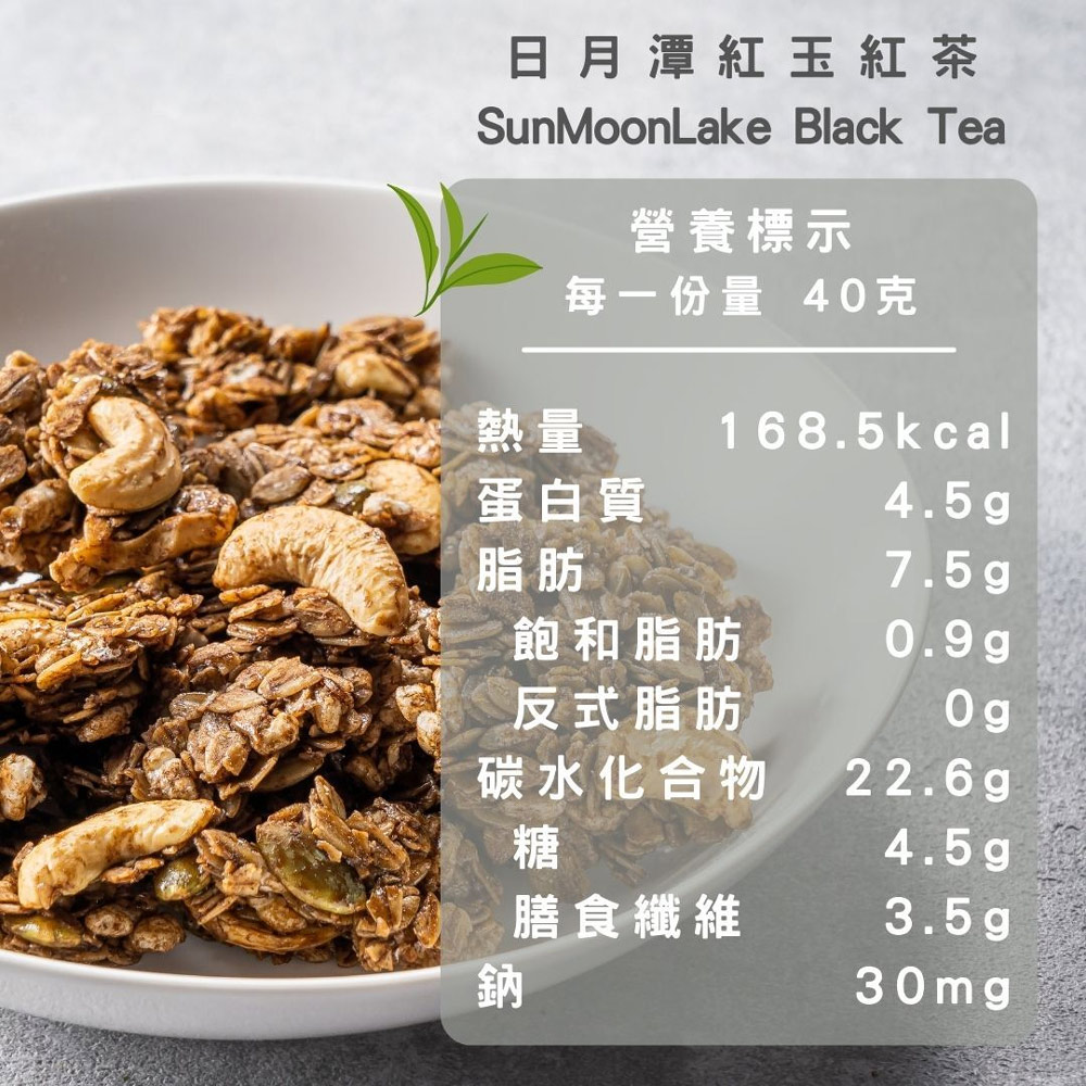 日月潭紅茶-有機燕麥脆片、米香、腰果、有機蔗糖、芥花油、台茶18號(紅玉)、玉米來源可溶性纖維、純黃豆粉、鹽