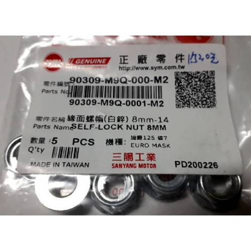 三陽原廠螺帽90309-M9Q-000-M2 規格:8MM-14 內容物:1包5個1個30元 適用機種:迪爵125 碟7