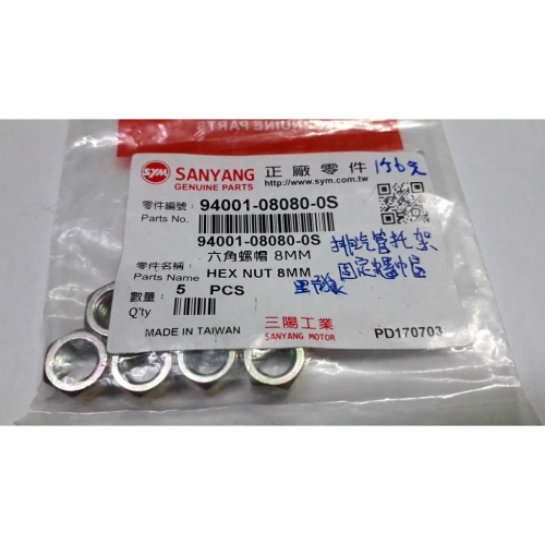 三陽原廠排氣管托架固定螺帽94001-08080-0S 規格:8MM 內容物:1包5個 1個6元 適用機種:野狼