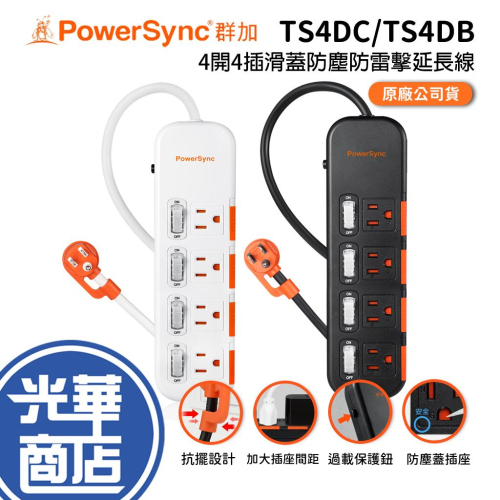 🔹 Powersync 群加 4開4插 滑蓋防塵防雷擊延長線 1.2M 白 (TS4DB412)