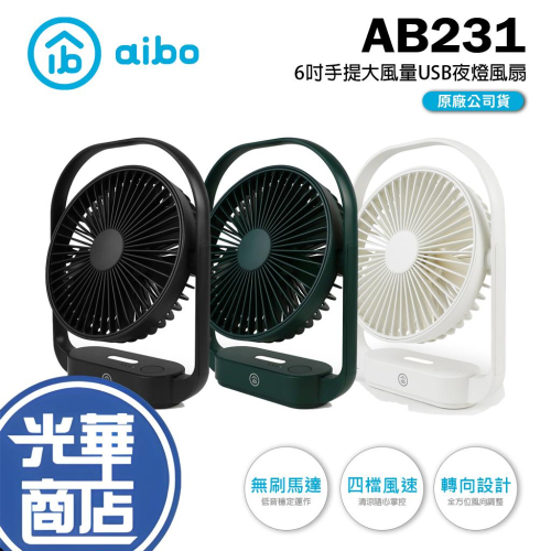 aibo AB231 6吋超薄美型 手提式大風量USB風扇/夜燈 白 綠 黑