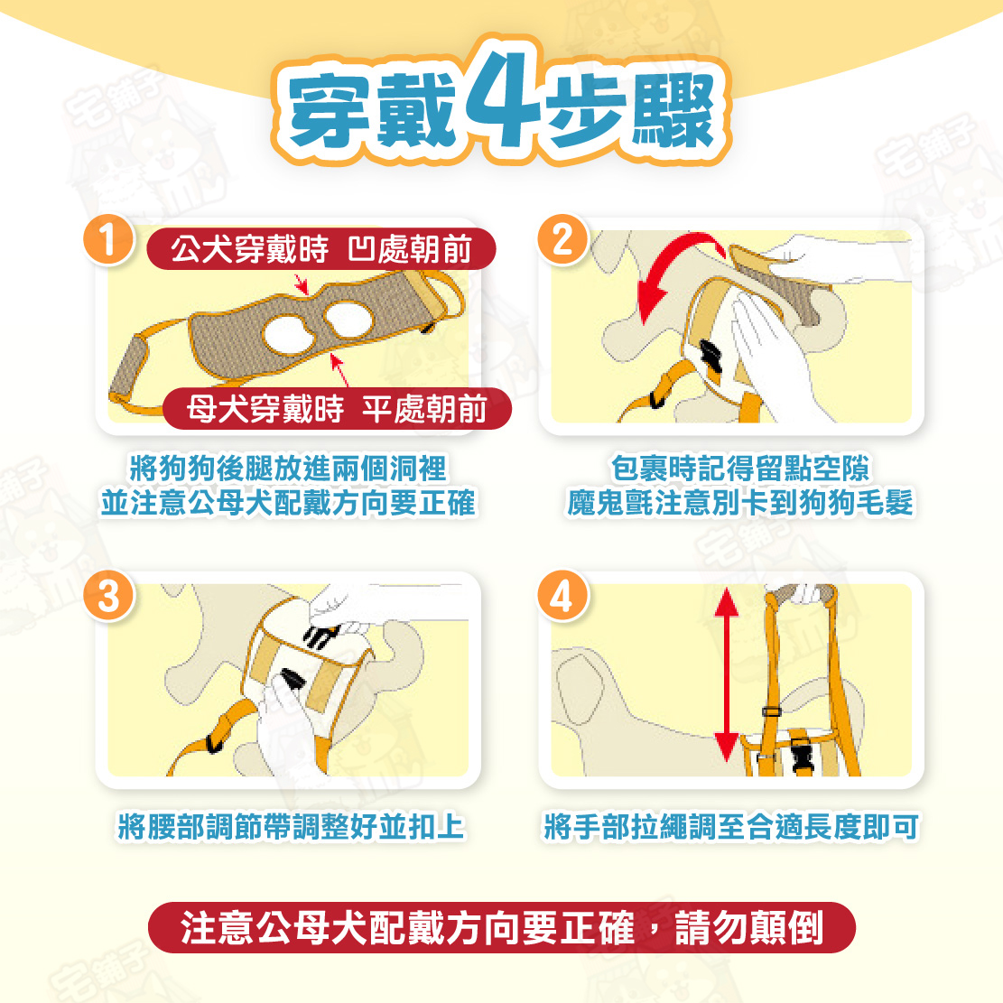 ▪1.如果是公犬,請將帶子的凹處朝前;如果是母犬,請將無凹處朝前,請把狗狗的後腳放進兩個洞裡,並注意公犬母犬的方向請物顛倒。