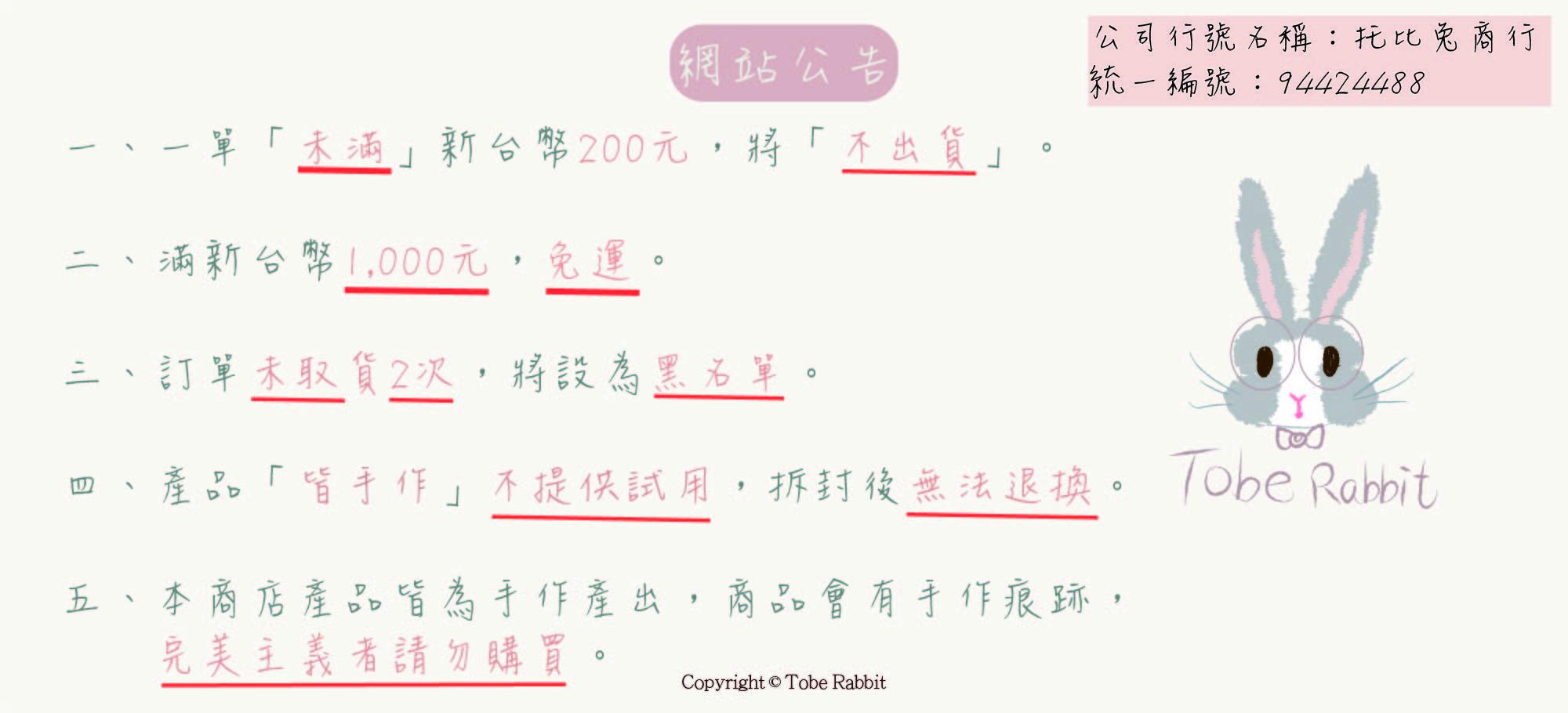 <p class="MsoNormal"><span lang="en-us" style="font-family:'標楷體'&#59;" xml:lang="en-us">1.</span><span style="font-family:'標楷體'&#59;">一單「未滿」新台幣<span lang="en-us" xml:lang="en-us">200</span>元,將「不出貨」。<span lang="en-us" xml:lang="en-us"></span></span></p><p></p><p class="MsoNormal"><span lang="en-us" style="font-family:'標楷體'&#59;" xml:lang="en-us">2.</span><span style="font-family:'標楷體'&#59;">滿新台幣<span lang="en-us" xml:lang="en-us">1,000</span>元,免運。<span lang="en-us" xml:lang="en-us"></span></span></p><p></p><p class="MsoNormal"><span lang="en-us" style="font-family:'標楷體'&#59;" xml:lang="en-us">3.</span><span style="font-family:'標楷體'&#59;">訂單未取貨<span lang="en-us" xml:lang="en-us">2</span>次,將設為黑名單。<span lang="en-us" xml:lang="en-us"></span></span></p><p></p><p class="MsoNormal"><span lang="en-us" style="font-family:'標楷體'&#59;" xml:lang="en-us">4.</span><span style="font-family:'標楷體'&#59;">產品「皆」不提供試用,拆封後無法退換。<span lang="en-us" xml:lang="en-us"></span></span></p><p></p><p class="MsoNormal"><span lang="en-us" style="font-family:'標楷體'&#59;" xml:lang="en-us">5.</span><span style="font-family:'標楷體'&#59;">本商店產品皆為手作產出,商品會有手作痕跡,完美主義者請勿購買。<span lang="en-us" xml:lang="en-us"></span></span></p><p></p><p> <span lang="en-us" style="font-size:12pt&#59;font-family:'標楷體'&#59;" xml:lang="en-us">6.</span><span style="font-size:12pt&#59;font-family:'標楷體'&#59;">開箱請錄影,無錄影無根據,恕不受理補退貨。</span></p>