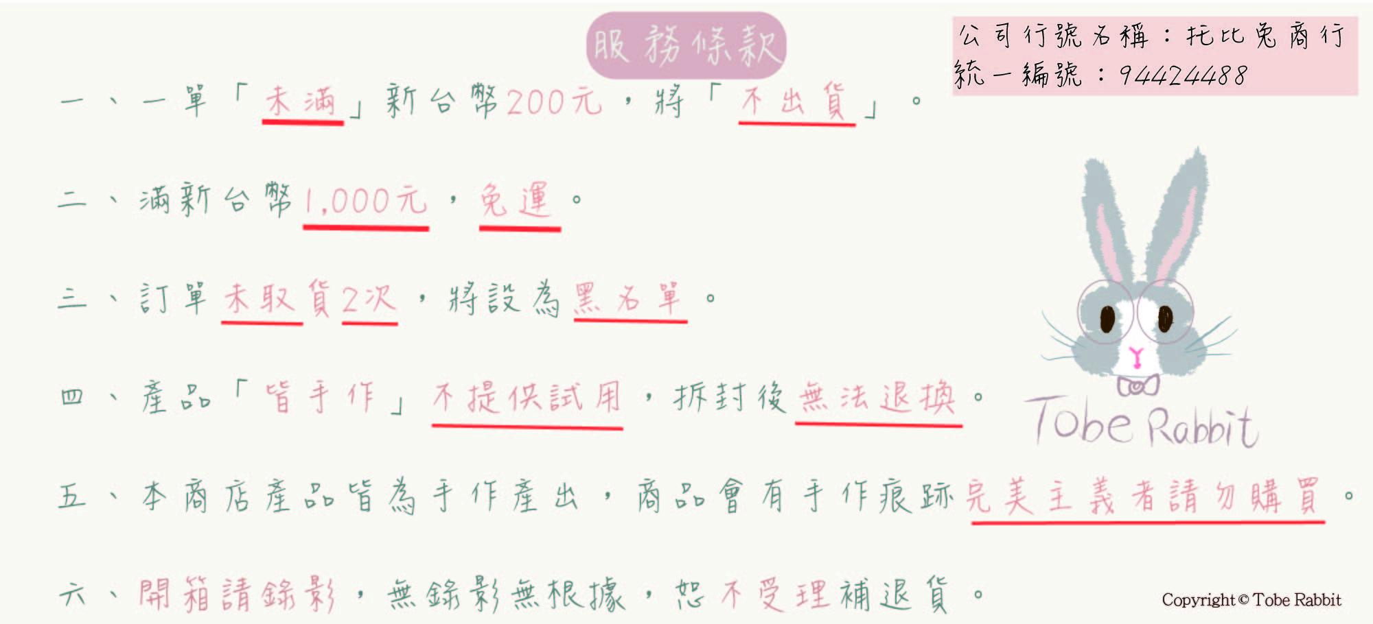 <p class="MsoNormal"><span lang="en-us" style="font-family:'標楷體'&#59;" xml:lang="en-us">1.</span><span style="font-family:'標楷體'&#59;">一單「未滿」新台幣<span lang="en-us" xml:lang="en-us">200</span>元,將「不出貨」。<span lang="en-us" xml:lang="en-us"></span></span></p><p></p><p class="MsoNormal"><span lang="en-us" style="font-family:'標楷體'&#59;" xml:lang="en-us">2.</span><span style="font-family:'標楷體'&#59;">滿新台幣<span lang="en-us" xml:lang="en-us">1,000</span>元,免運。<span lang="en-us" xml:lang="en-us"></span></span></p><p></p><p class="MsoNormal"><span lang="en-us" style="font-family:'標楷體'&#59;" xml:lang="en-us">3.</span><span style="font-family:'標楷體'&#59;">訂單未取貨<span lang="en-us" xml:lang="en-us">2</span>次,將設為黑名單。<span lang="en-us" xml:lang="en-us"></span></span></p><p></p><p class="MsoNormal"><span lang="en-us" style="font-family:'標楷體'&#59;" xml:lang="en-us">4.</span><span style="font-family:'標楷體'&#59;">產品「皆」不提供試用,拆封後無法退換。<span lang="en-us" xml:lang="en-us"></span></span></p><p></p><p class="MsoNormal"><span lang="en-us" style="font-family:'標楷體'&#59;" xml:lang="en-us">5.</span><span style="font-family:'標楷體'&#59;">本商店產品皆為手作產出,商品會有手作痕跡,完美主義者請勿購買。<span lang="en-us" xml:lang="en-us"></span></span></p><p></p><p> <span lang="en-us" style="font-size:12pt&#59;font-family:'標楷體'&#59;" xml:lang="en-us">6.</span><span style="font-size:12pt&#59;font-family:'標楷體'&#59;">開箱請錄影,無錄影無根據,恕不受理補退貨。</span></p>