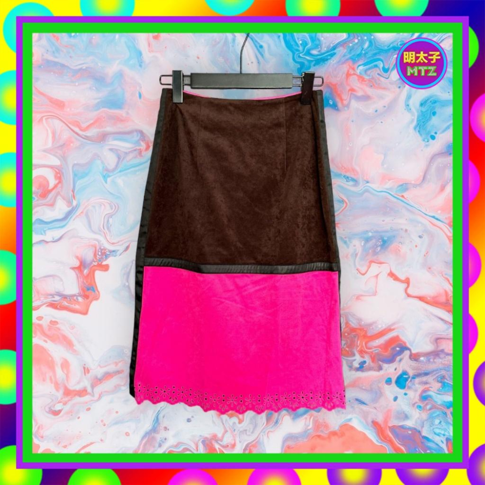 二手 CHAVANA 桃紅咖配色 絨布 拼接 合身 高腰 26 長裙 F1129 【明太子 古著應召站】