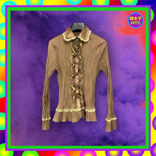 二手 巧克力色 壓褶 蕾絲 彈性 長袖 襯衫 F1117 【明太子 古著應召站】