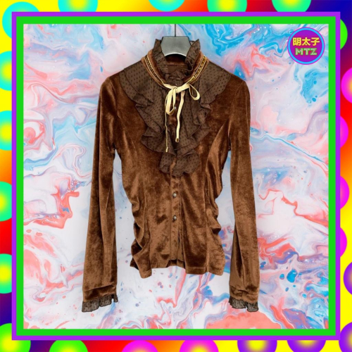 二手 咖啡色 絨面 綁帶 荷葉領 側邊抓褶 彈性 長袖 襯衫 F1116 【明太子 古著應召站】