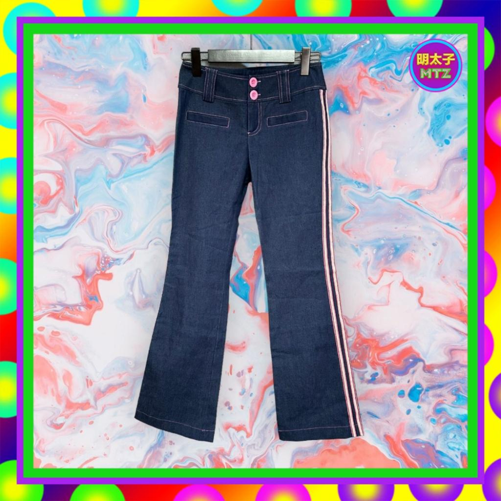二手 BANK 深藍粉紅配色 牛仔 偏薄 彈性 拼接 織帶 微喇叭 低腰 27 長褲 F1019 【明太子 古著應召站】