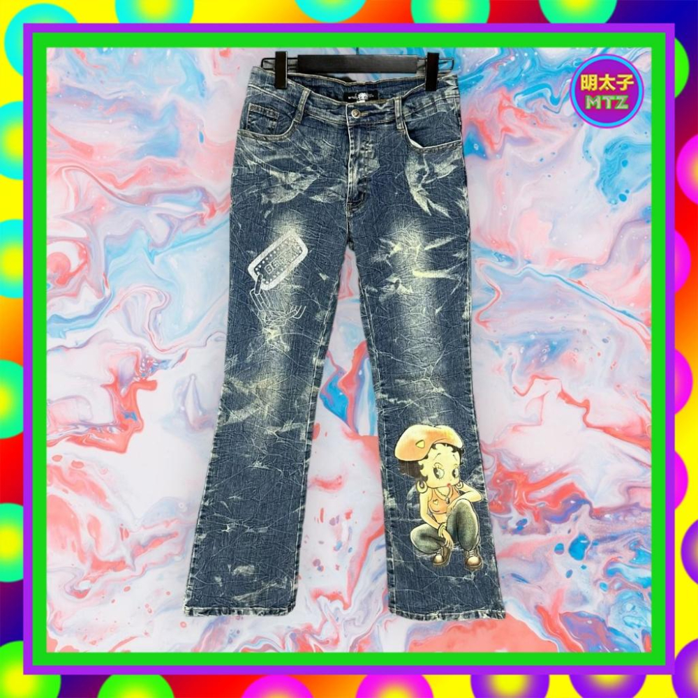 二手 貝蒂噗 藍色 牛仔 彈性 皺紋 口袋 印花 微喇叭 低腰 29 長褲 F928 【明太子 古著應召站】